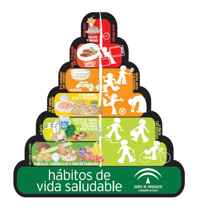 La Consejería de Salud de la Junta de Andalucía ha publicado la famosa pirámide de alimentación (similar a las de las otras consejerías de salud) donde se incluyen los alimentos que una persona debe ingerir siendo la base lo que se debe de comer a diario y la punta de la pirámide lo que se debe de comer de forma muy ocasional. También incluye ejercicio físic.